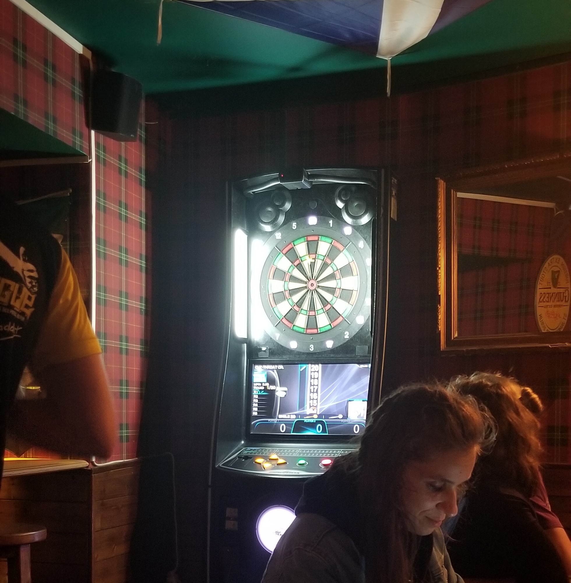 Another neat thing they had was an electronic darts board. The thing records your points automatically when you throw the dart. I’ve never seen that before. Here is an awkward picture of it, with some girl in the foreground. 😀 You can also see more of that sweet tartan wallpaper.