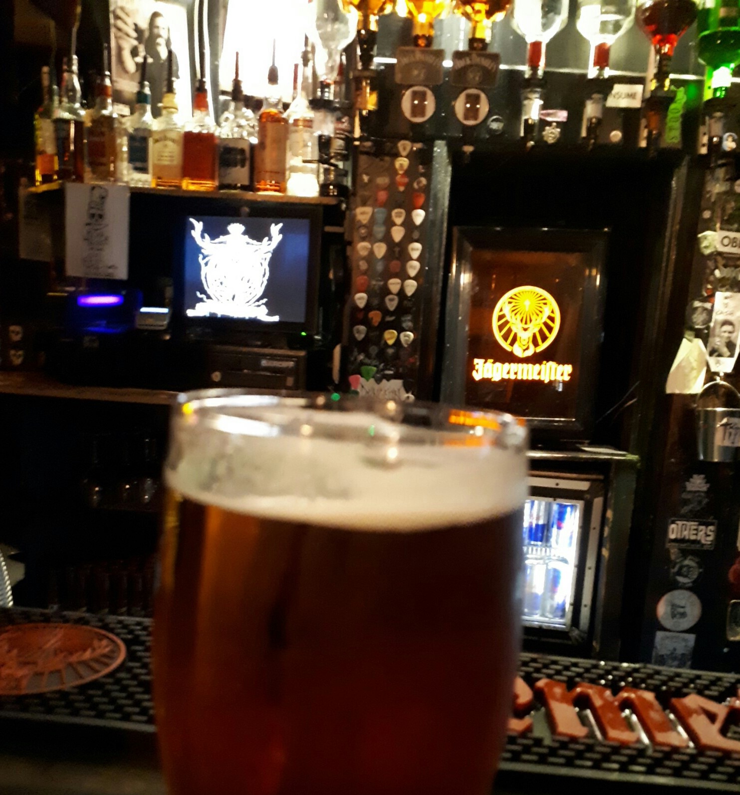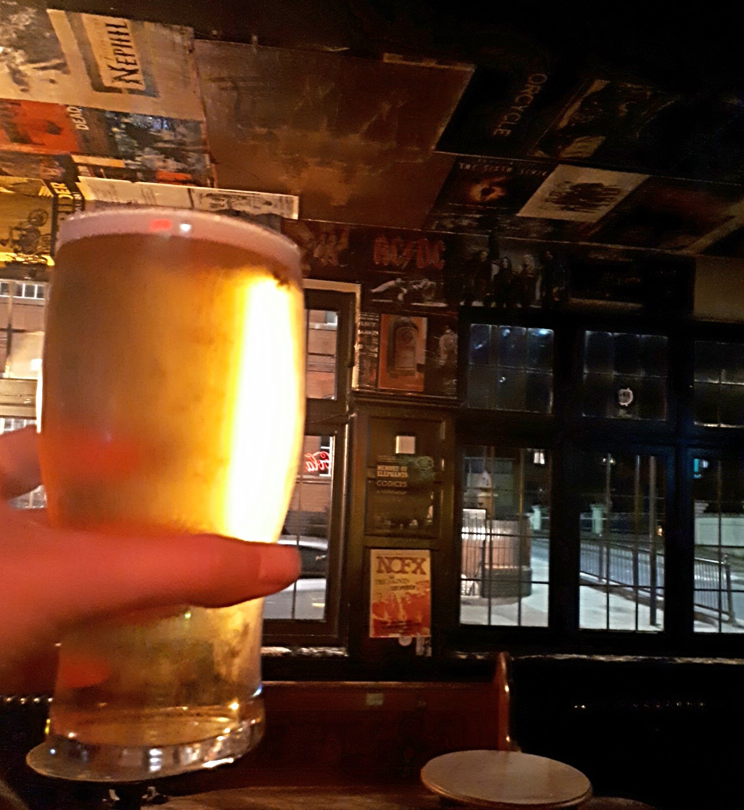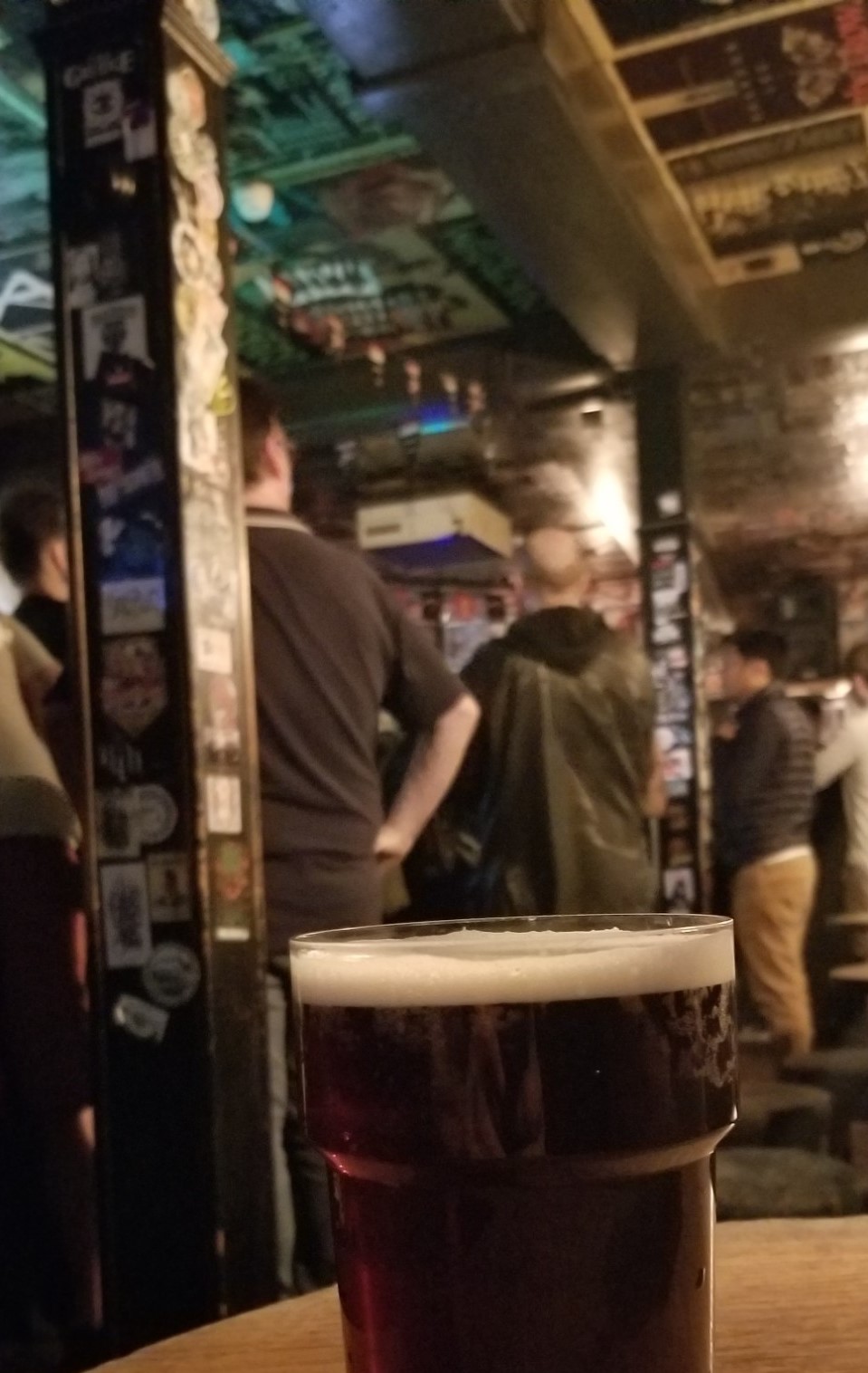 It’s very dive-y and the walls, the ceiling, and every available surface are completely covered with posters, stickers, guitar picks, etc.